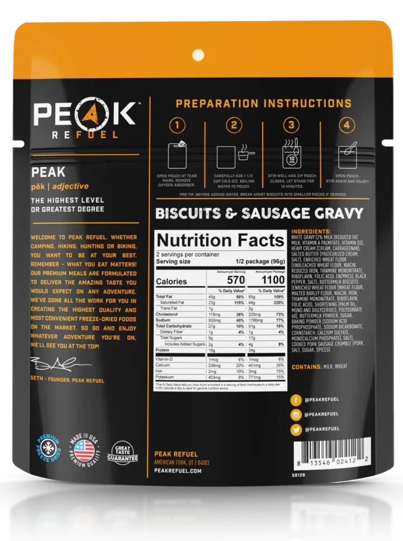 HIGH PROTEIN | 100% REAL MEAT | PREMIUM INGREDIENTS – Biscuits & Sausage Gravy: Buttermilk Biscuits, Cooked Sausage Crumbles, & Peppered Country Style Gravy – This pouch may have bilingual sticker on back of pouch. PRO TIP: Before adding water. Break apart biscuits into smaller pieces if desired.