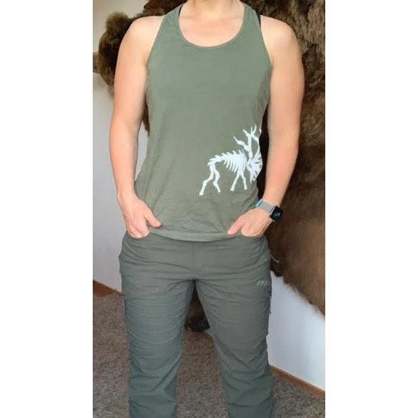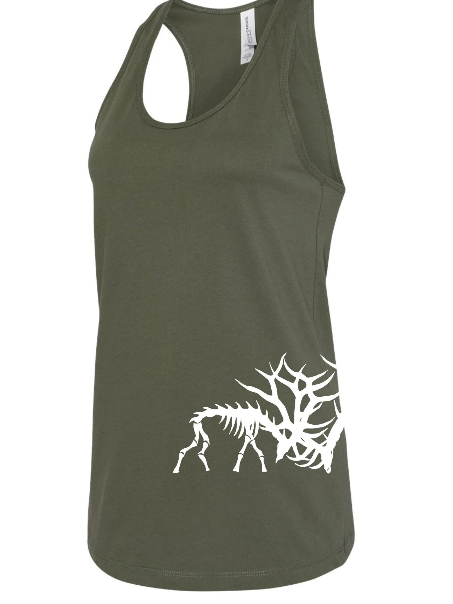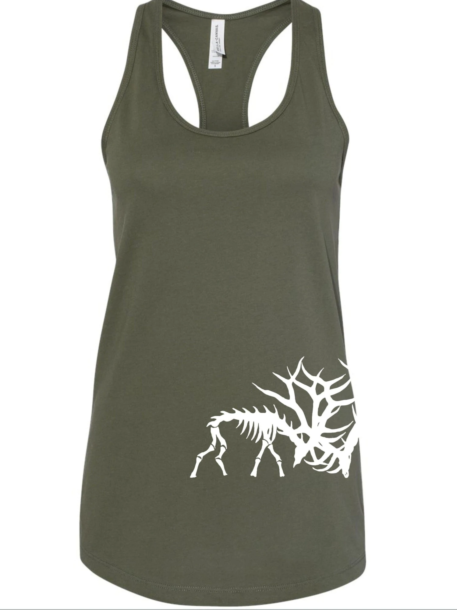 This women’s racerback tank is comfortable and form fitting with a wrap around Stuck N The Rut fighting bulls design.