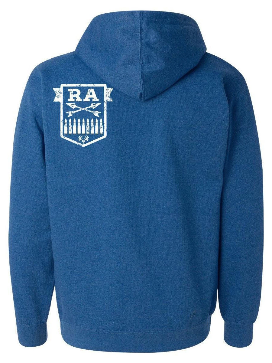 The War Bird Hoodie is on royal heather blue colored material. It is form fitting and ultra comfortable.It is made out of combed ringspun cotton/polyester.