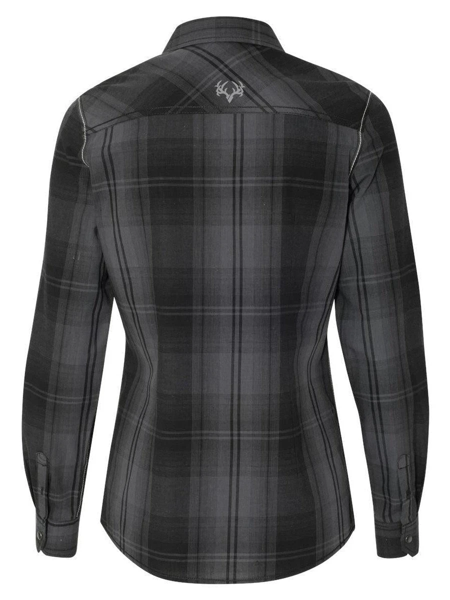 The Womens Jasper Western Shirt is on a Black and Grey patterned long sleeve summary up. It is form fitting and ultra comfortable. It is made out of cotton/polyester. The designs are embroidered.