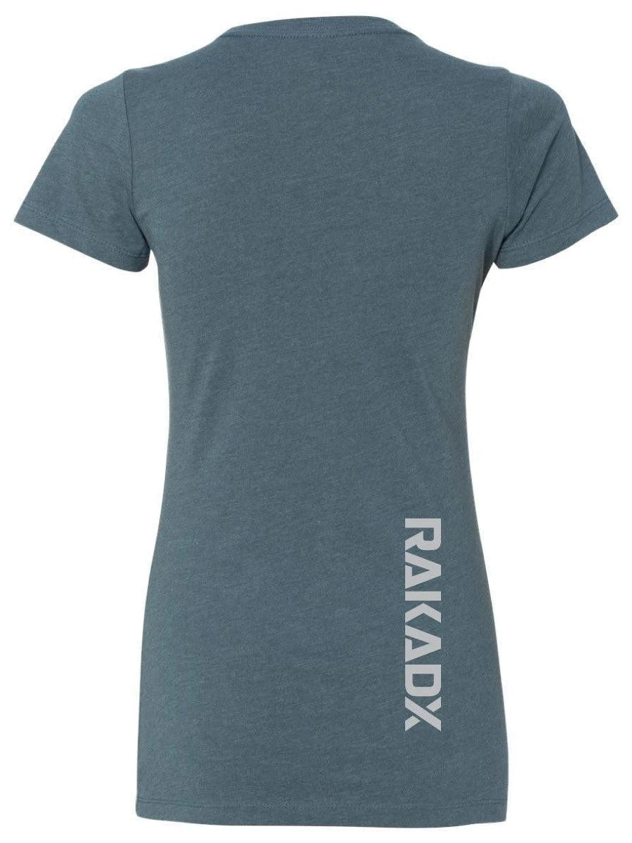 The Womens Rak Logo Shield is on an indigo colored tee. It is form fitting and ultra comfortable. It is made out of combed ringspun cotton/polyester.